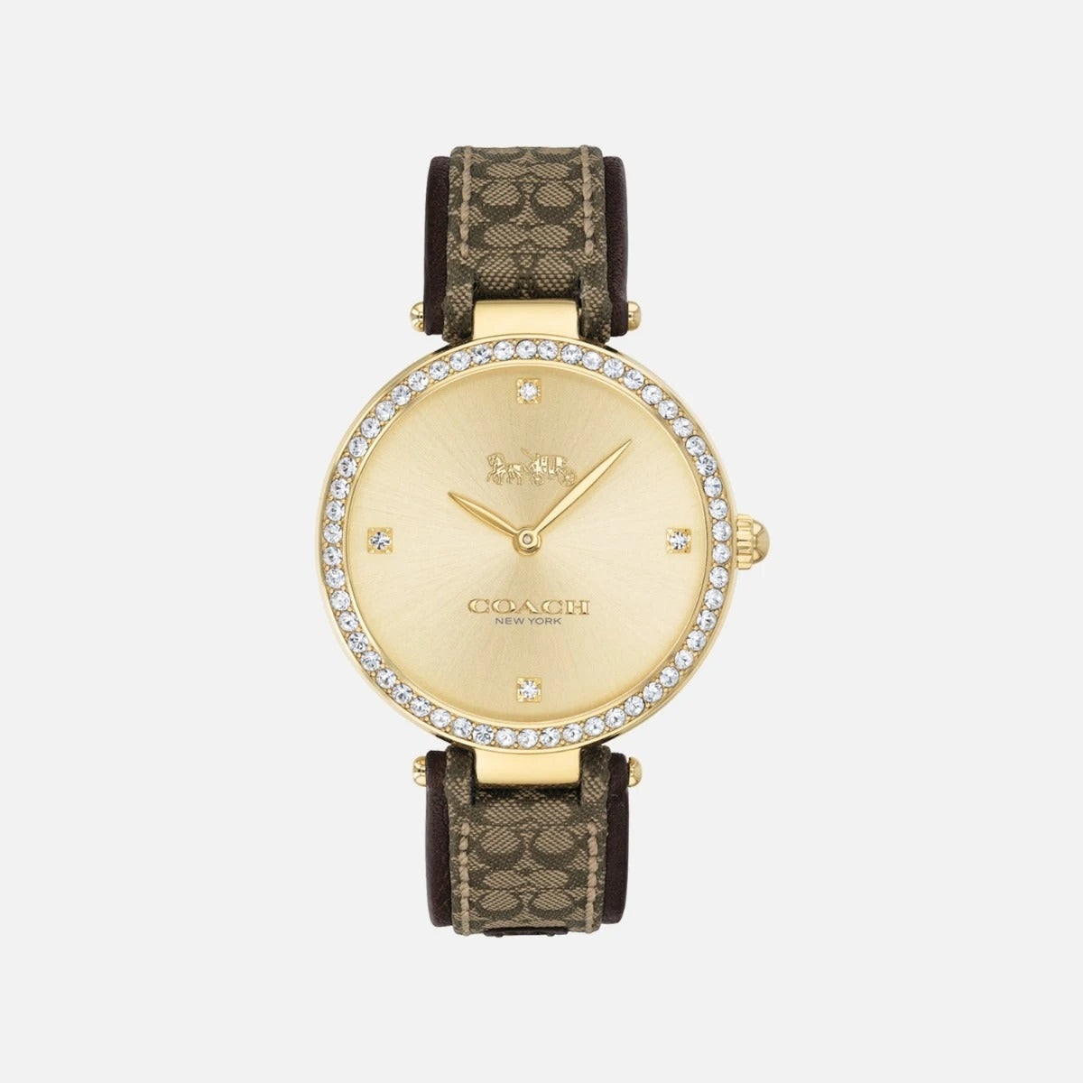 Elevate your wristwear game with the elegant Coach Park Watch. Designed for the modern woman who appreciates timeless fashion, this watch features a gold-tone case paired beautifully with a signature jacquard strap. Crystal accents on the dial add a touch of sparkle, making it a perfect blend of sophistication and subtle glamour. The reliable quartz movement ensures precision, while the buckle closure offers a secure and adjustable fit.